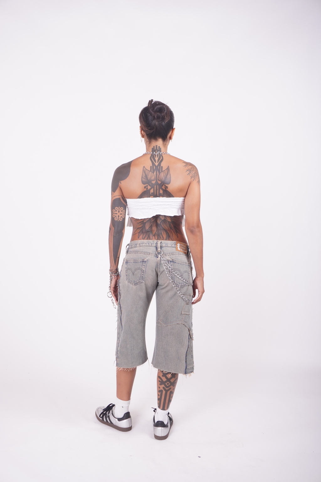 bermuda jeans com lavagem rara esverdeada e aplicação de ilhós. essa peça única foi projetada para quem busca um visual diferenciado e autêntico. o tom esverdeado exclusivo proporciona um toque vintage, enquanto os ilhós adicionam um detalhe moderno.