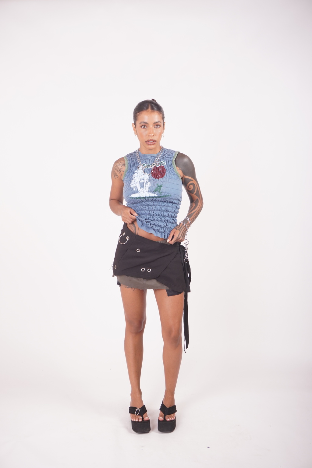 *tank top com estampa vintage possui franzido para modelar a silhueta