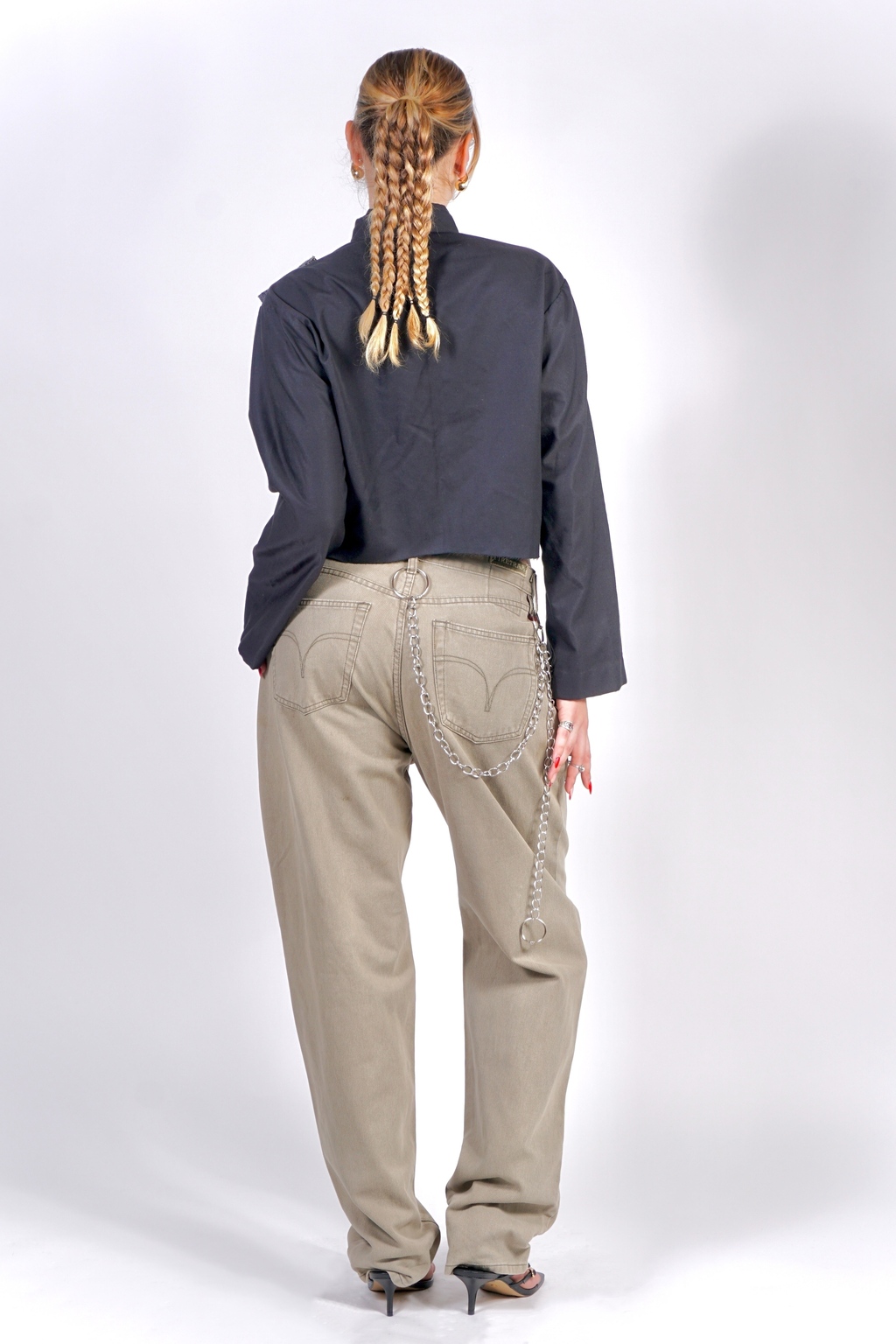 *jaqueta preta com aplicação de jeans, ilhós e argola, manga ampla com fechamento de zíper frontal